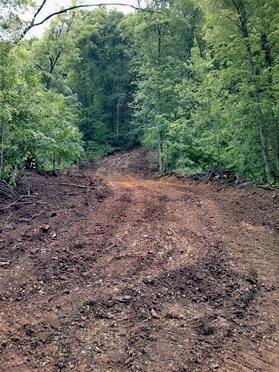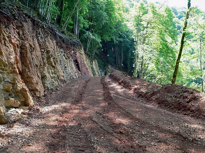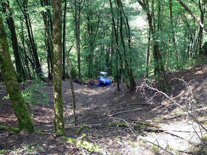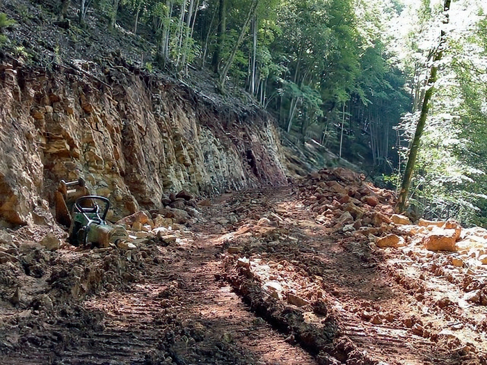 chemin d'accès a été construit dans la montagne. Une pelleteuse, munie d'un