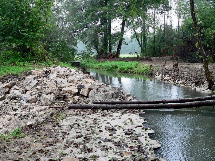 Cet ouvrage d'art avait déjà été rénové en 1982 par la Direction Départementale de l'Agriculture (D.D.A.), mais avait très mal vieilli. Il a été réparé et consolidé avec des palplanches, des pierres et du béton.