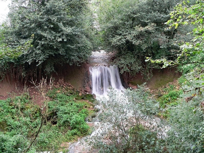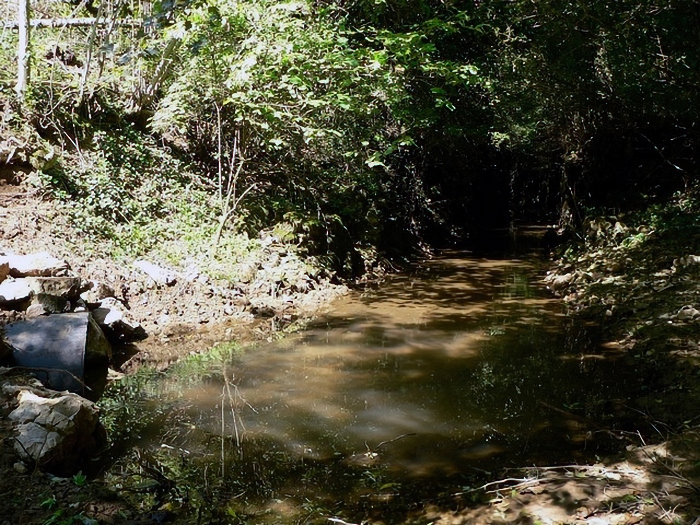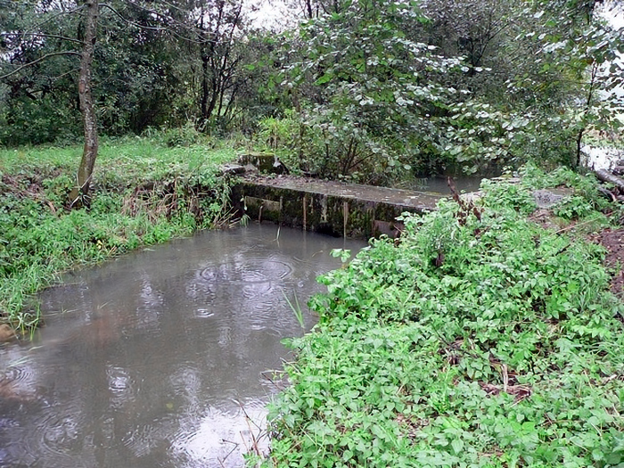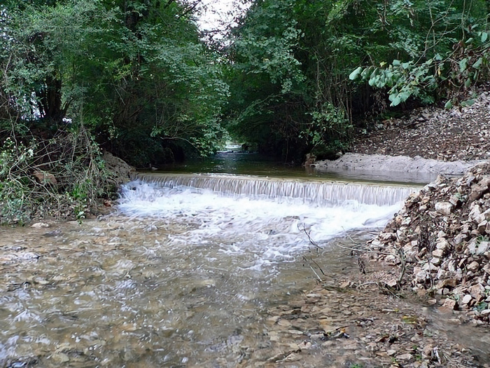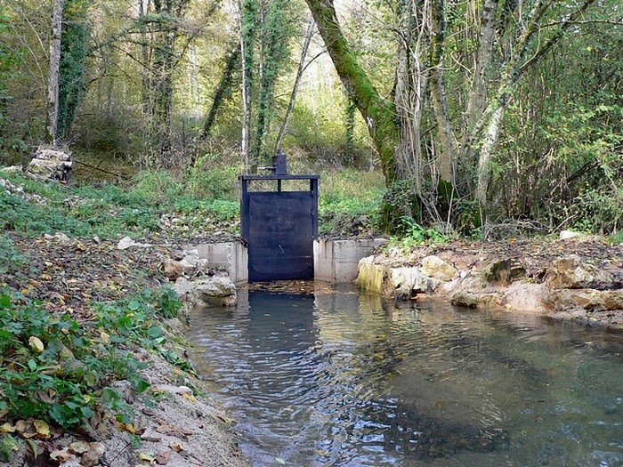 Sur sa droite, une petite retenue d'eau équipée de trois vannes, dont une automatique, permet de réguler l'alimentation du bras qui passe devant le restaurant l'Auberge du Château de Vaîte et qui se perd un peu plus loin dans le village dans une perte dite Trou de Picote.