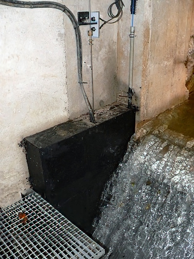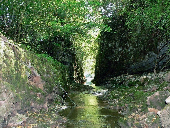 Pour alimenter la micro-centrale hydroélectrique, la sortie de la première galerie a été percée. En fait, le Gour sort à nouveau au même endroit qu'en 1850 ! A la différence que l'eau est désormais captée et reliée à deux conduites forcées grâce à un collecteur, réalisé en béton armé, et scindé en deux compartiments :