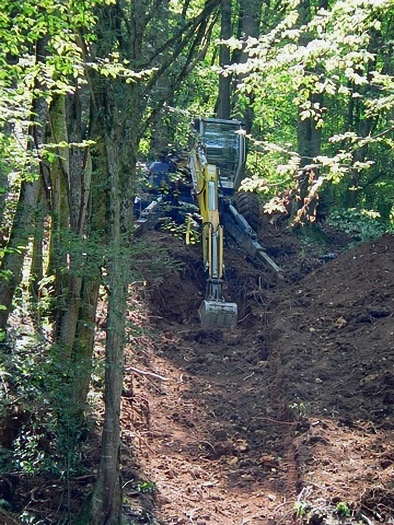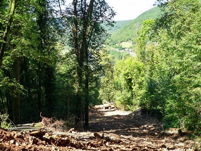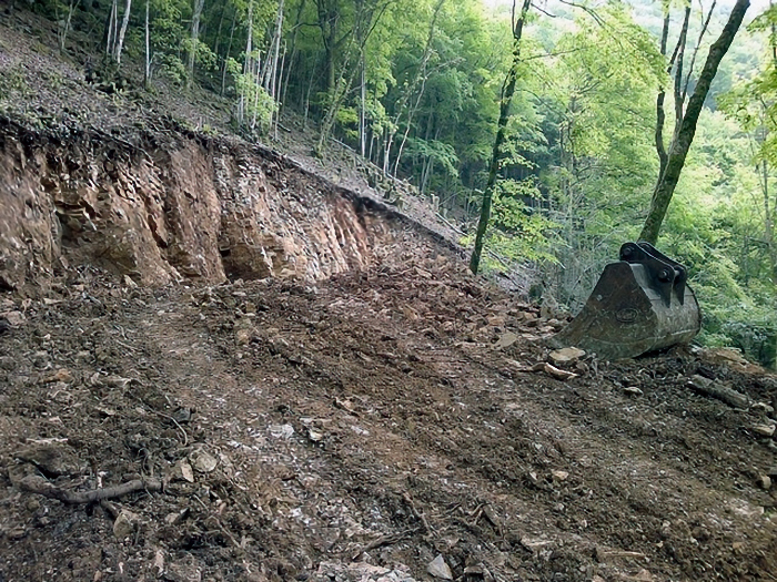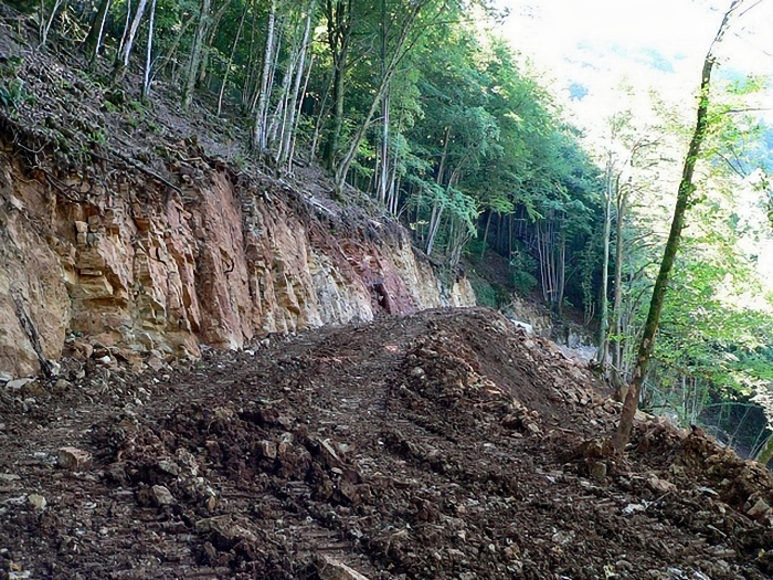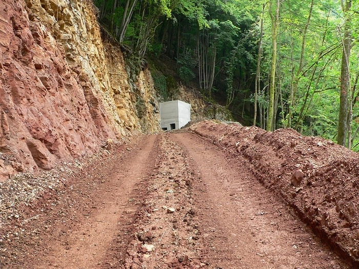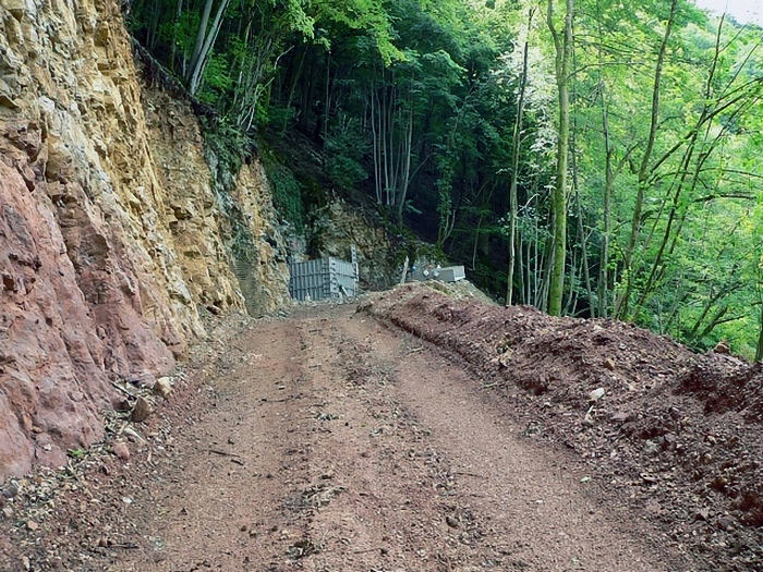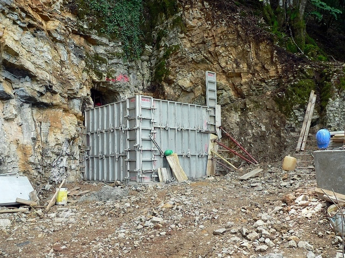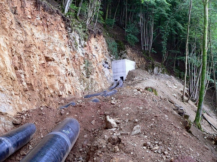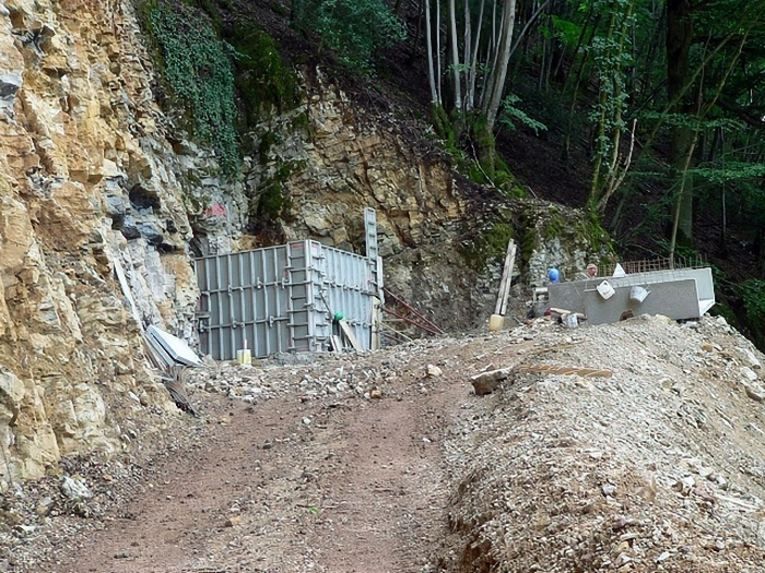Pour accéder à l'extrémité de la première galerie et réaliser le collecteur, un chemin d'accès a été construit dans la montagne. Une pelleteuse, munie d'un brise roche hydraulique, a fracturé la roche pendant quatre semaines.