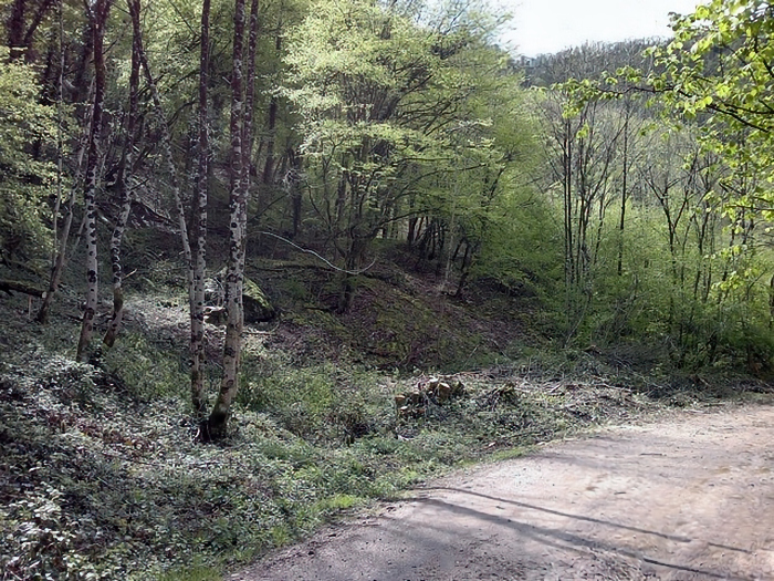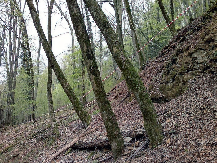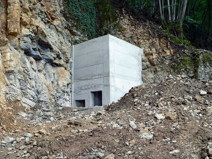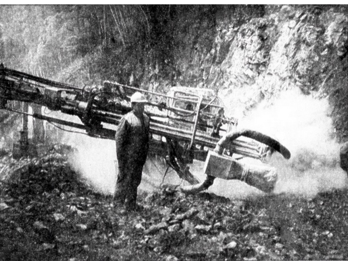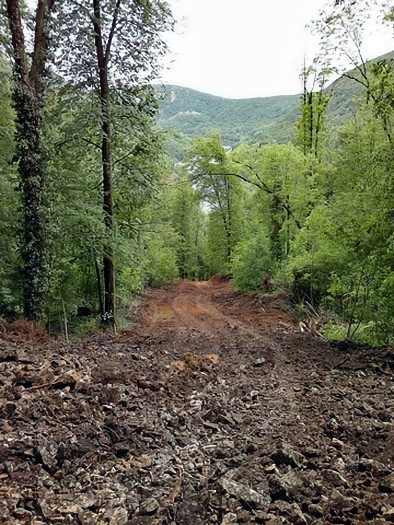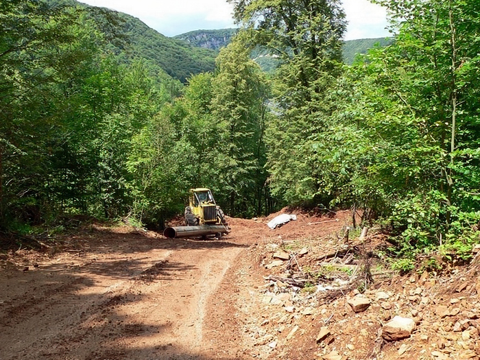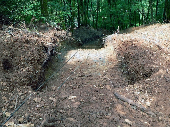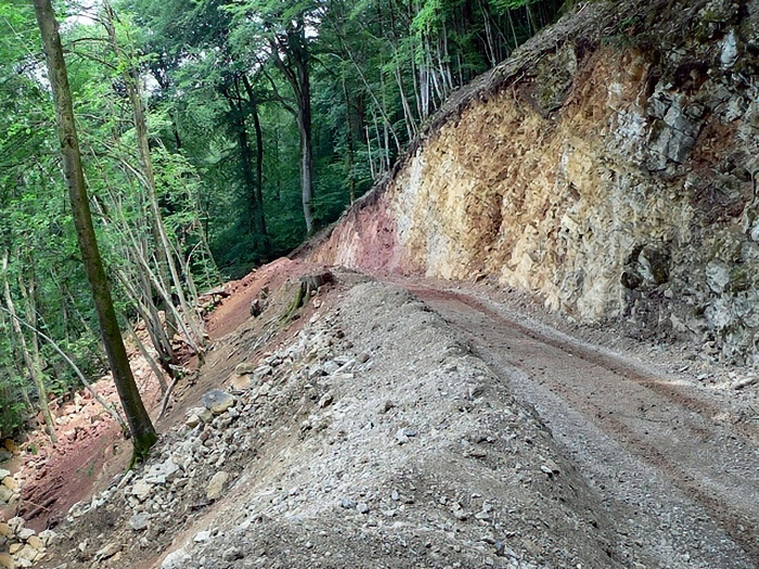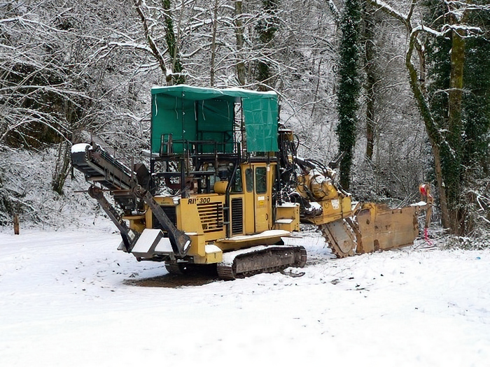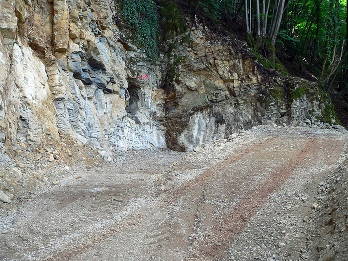 Pour accéder à l'extrémité de la première galerie et réaliser le collecteur, un chemin d'accès a été construit dans la montagne. Une pelleteuse, munie d'un brise roche hydraulique, a fracturé la roche pendant quatre semaines.
