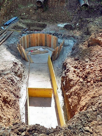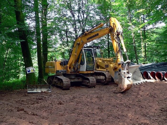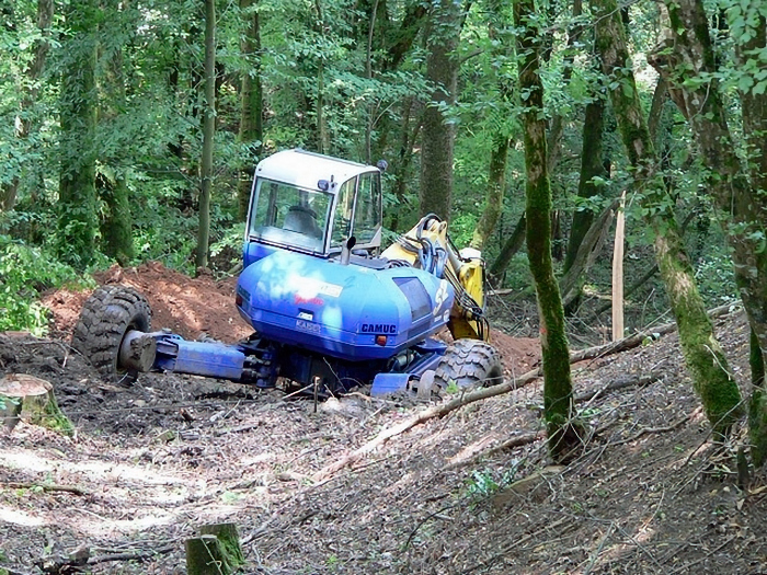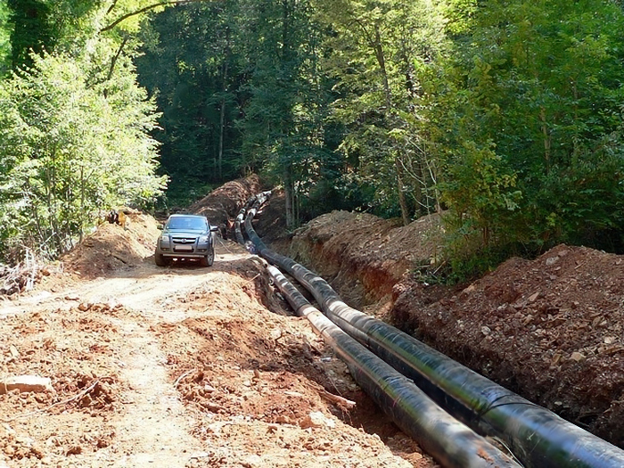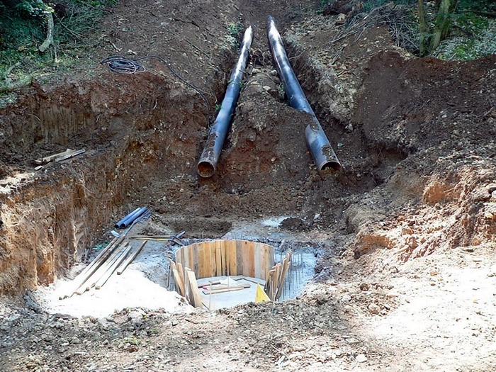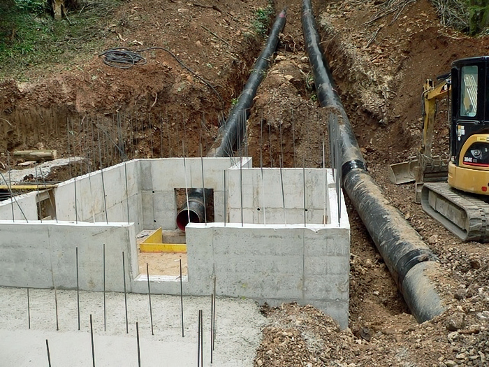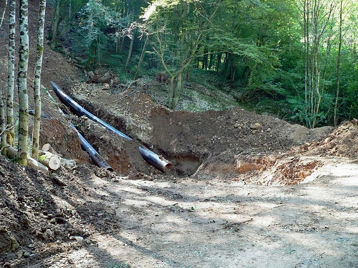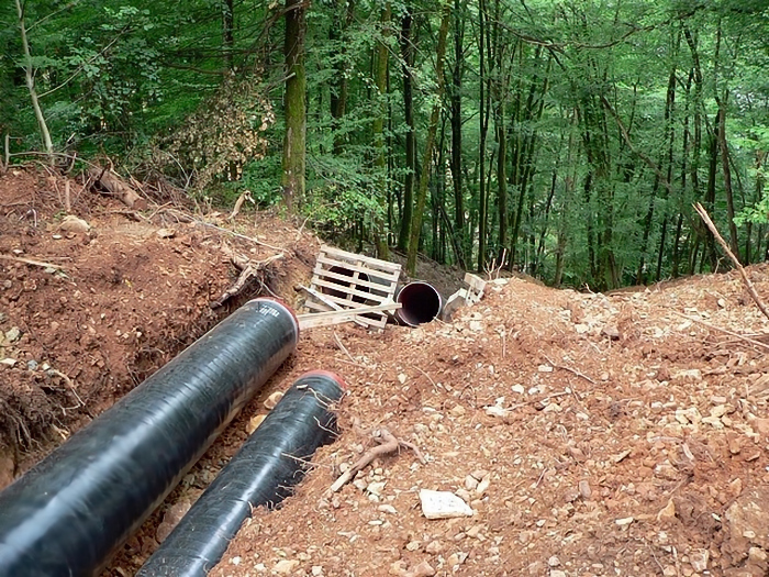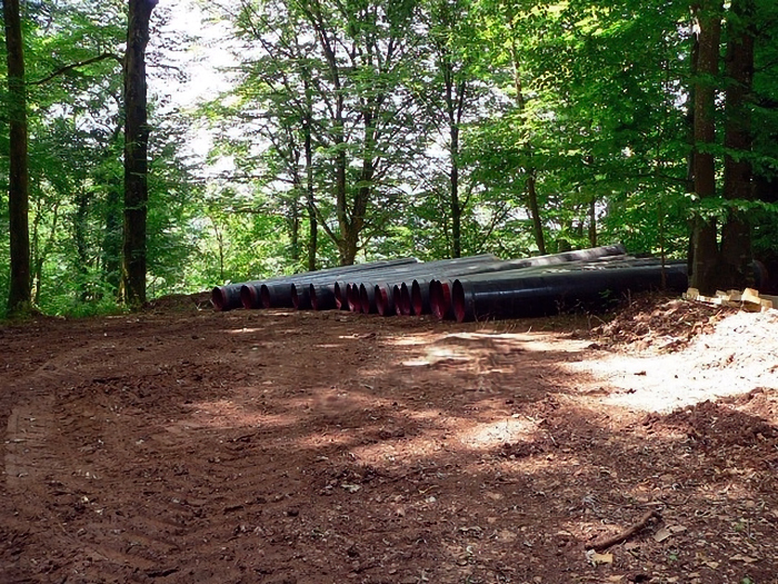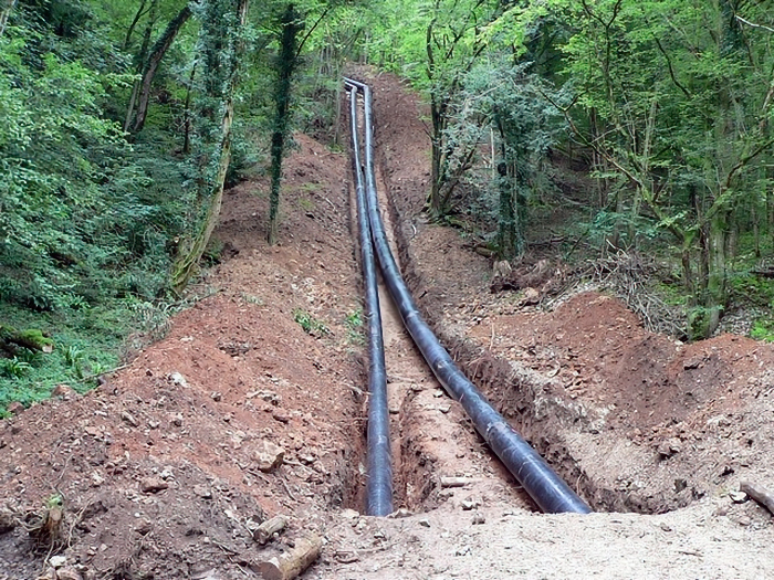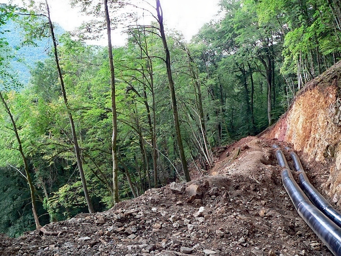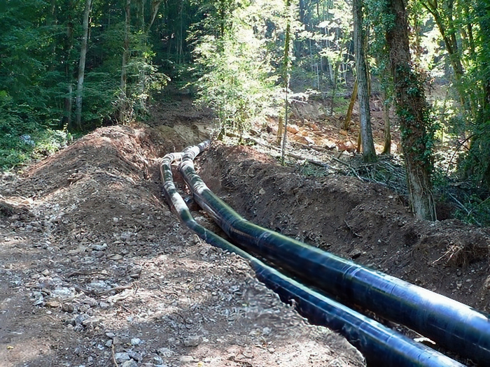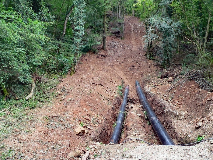 Afin de faciliter l'emboîtage des tuyaux, les conduites forcées ont été posées de la micro-centrale hydroélectrique vers le collecteur. Du fait du fort pourcentage d'inclinaison de la pente en certains endroits, la construction de la tranchée d'enfouissement a fait appel à une pelleteuse spéciale appelée pelle araignée. Des bras articulés, similaires aux pattes du susdit animal, lui permettent de garder sa stabilité et son horizontalité quelque soit la déclivité et de travailler en toute sécurité.