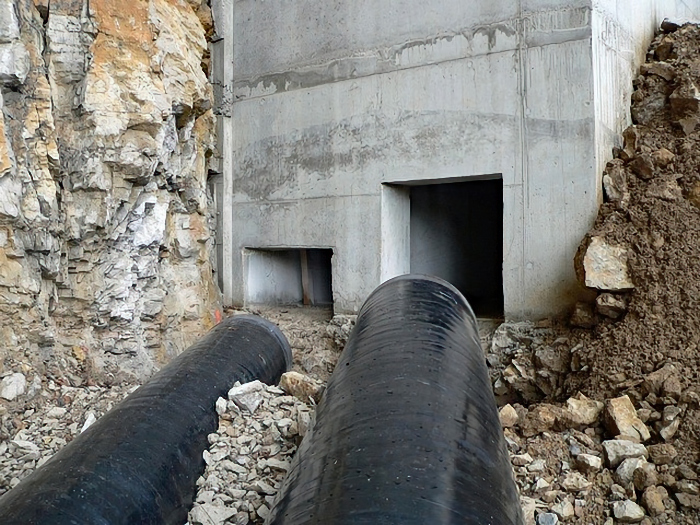 Les tuyaux métalliques des deux conduites forcées ont été fabriqués en Turquie par la société Özbal Çelik Boru pour le compte du grossiste français Oryx Eleven. Chaque élément mesure 6 mètres de long et 5 millimètres d'épaisseur. Au total, 28 tuyaux de 550 millimètres de diamètre et 28 tuyaux de 700 millimètres de diamètre ont été livrés.