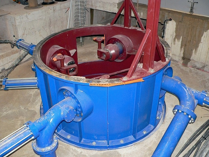 Deux vannes, en sortie du collecteur, permettent de réguler le débit d'eau dans les deux conduites forcées et de mettre la micro-centrale hydroélectrique hors d'eau afin de procéder à des opérations de maintenance.